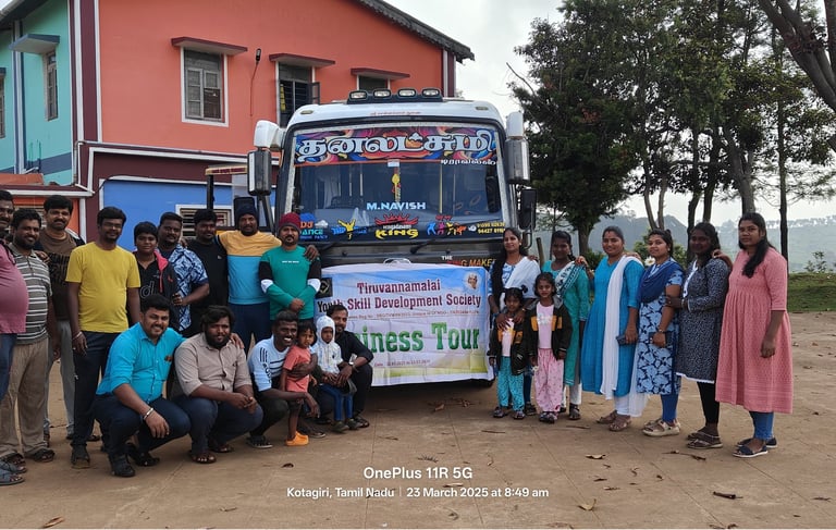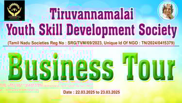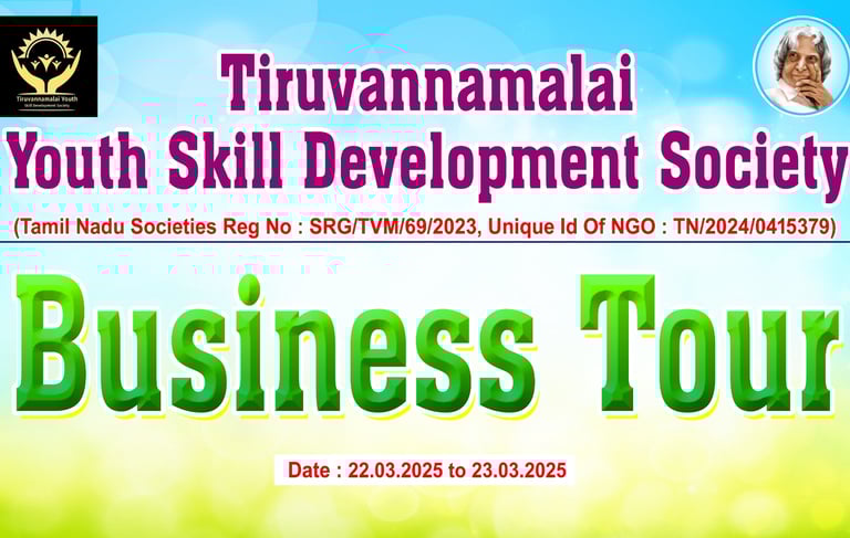 திருவண்ணாமலை இளைஞர் திறன் மேம்பாட்டுச்ங்கம் சமீபத்தில் ஒரு பயனுள்ள வணிகச் சுற்றுலாவை வெற்றிகரமாக நடத்தி முடித்தது. 22-03-2025 முதல் 23-03-202 வரை நடைபெற்ற இந்தச் சுற்றுலாவில், தொழில் மற்றும் வணிகத்தில் ஆர்வமுள்ள பல இளைஞர்கள் ஆர்வத்துடன் கலந்து கொண்டனர்.