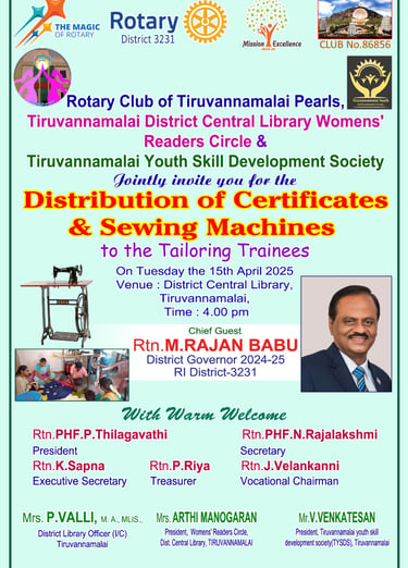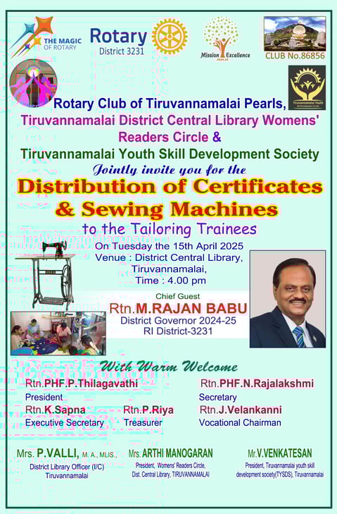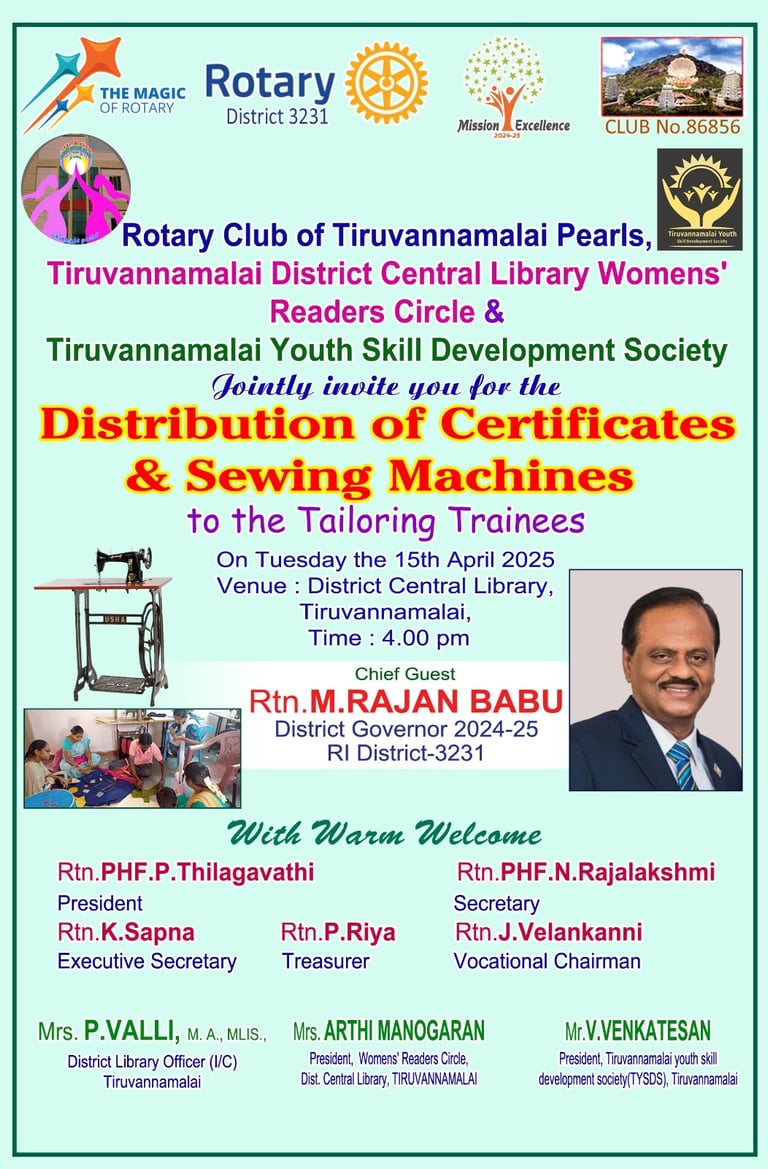 கடந்த 15 ஆம் தேதி மாலை 4 மணியளவில் நடைபெற்ற நிறைவு விழாவில், பயிற்சி பெற்ற பெண்களுக்கு சான்றிதழ்களும், தையல் இயந்திரங்களும் வழங்கப்பட்டன. ரோட்டரி மாவட்ட ஆளுநர் ஆர்.டி.என். எம்.ராஜன் பாபு அவர்கள் சிறப்பு விருந்தினராக கலந்து கொண்டு பயிற்சி பெற்றவர்களை வாழ்த்தினார்.